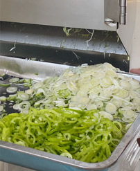 切菜機具備雙調頻功能,一端是切葉菜類,如長蔥,蒜苗,韭菜,芹菜,白菜,青菜等,一端是切球根莖類,如蘿卜,土豆,紅薯,芋頭,筍,洋蔥,茄子,蘋果,生姜等。根莖部分可切片(厚薄度2-10毫米可選),根莖部分切絲(2-10mm方絲可選),根莖部分切?。?mm,10mm,12mm,15mm,20mm),葉菜部分切段切條(長度1-90mm可調),具備雙調頻功能。